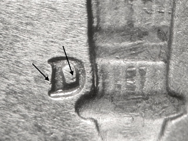 | WRPM-002 | D/D/D West and Tilted (Rotated) Die Markers: Obverse: NNW/SSE die scratch from the lower lip to the nose. Short die scratches NW above the upper lip. Reverse: Die gouge centered at the bottom of the M in AMERICA. E/W die scratches through EPU. E/W die scratches between the upper right side of the torch holder and the left side of the upper oak leaves. ENE and an ESE die scratches from the right upper side of the M in UNUM. |   |