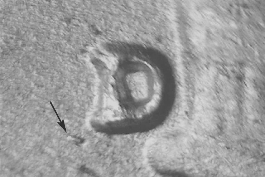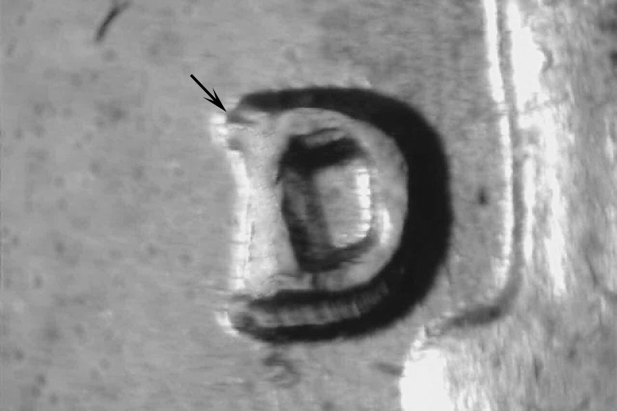 | WRPM-003 | D/D Tilted (Rotated) Die Markers: Obverse: Die scratches running NNE from upper first T in TRUST through D in GOD. Die break on nostril. Linear die gouge left of L in LIBERTY. Reverse: Die scratch running northwest from mint mark to R in RIB. Three die scratches running from the rim NNW to the second A in AMERICA and dot after DIME. Die scratch running NW from upper U in NUM. Die scratches running north from oak branch leaf under E in AMERICA. Two parallel die scratches running NE above O in ONE. | |