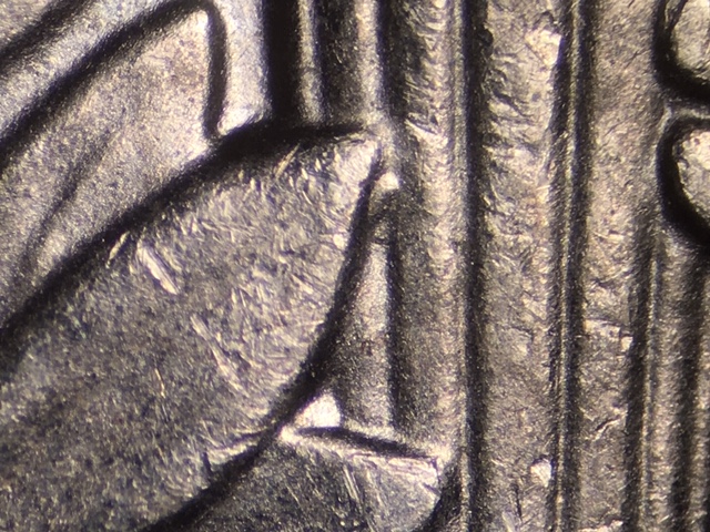 | SDDR-015 | Doubling to the east of the middle olive leaf overlapping the torch through the fluting. Die Markers: Obverse: SW-NE die scratches in front of the eye. SW-NE die scratches through the TY in LIBERTY. Reverse: Die gouge above the right side of the N in ONE. | |