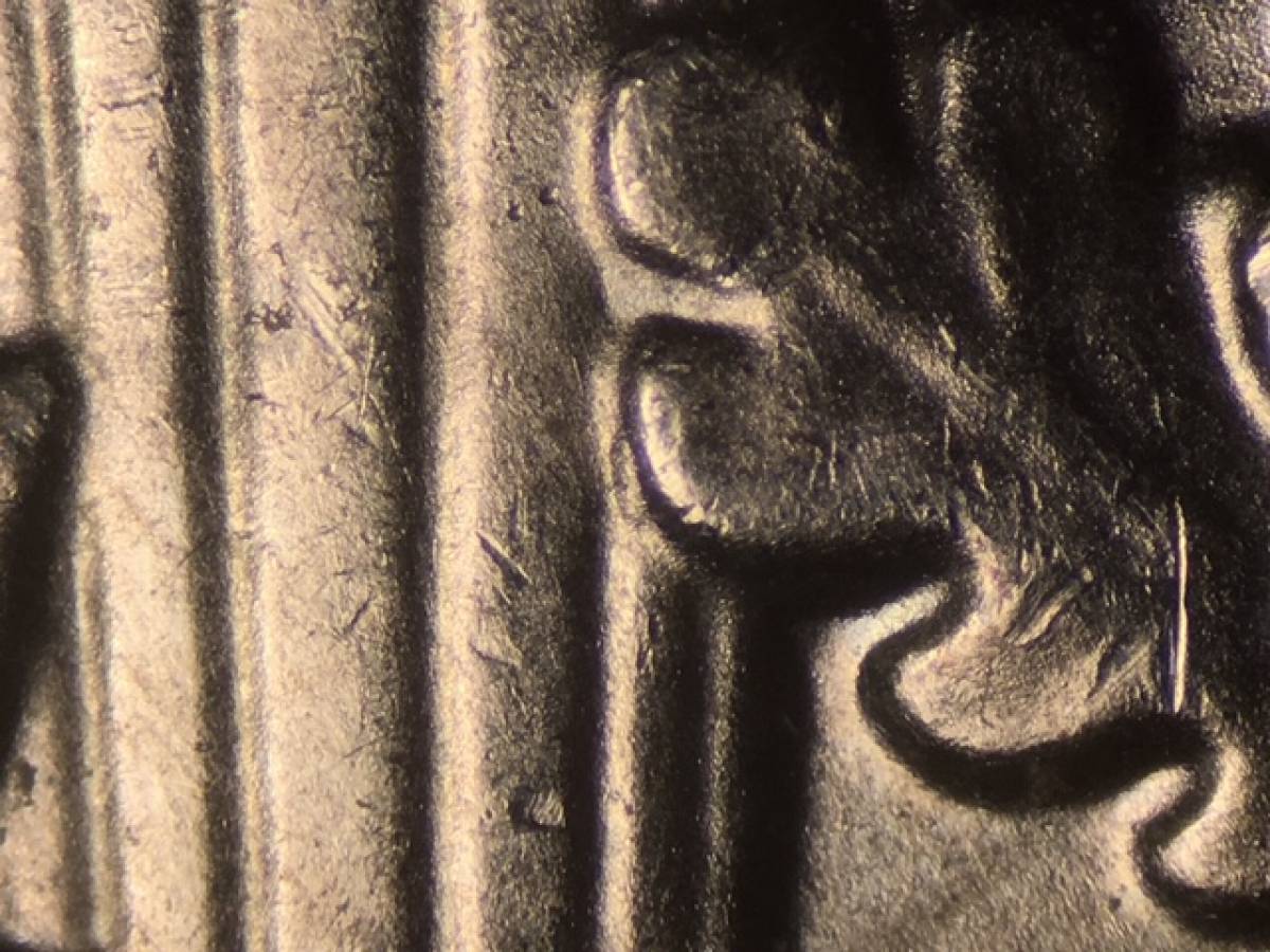 | SDDR-003 | Doubling to the south on the oak leaf overlapping the torch. Die Markers: Obverse: Die chips on the back of the lips and the eyebrow. Reverse: Die cracks and chips on the bottom and the top of the torch and on the first U in PLURIBUS. Die gouge to the left of the oak stem. | |