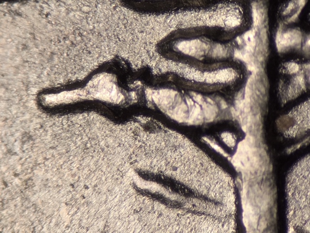 | SDDR-001 | Doubling to the west to the left of the second branch of the right tree. Die Markers: Obverse: Thin die scratches below the nose. Reverse: Pre-die break depressions below PLURIBUS and above 1805. Die gouge to the right of the T in UNITED. Die gouge above the right top of the second branch of the right tree. | |